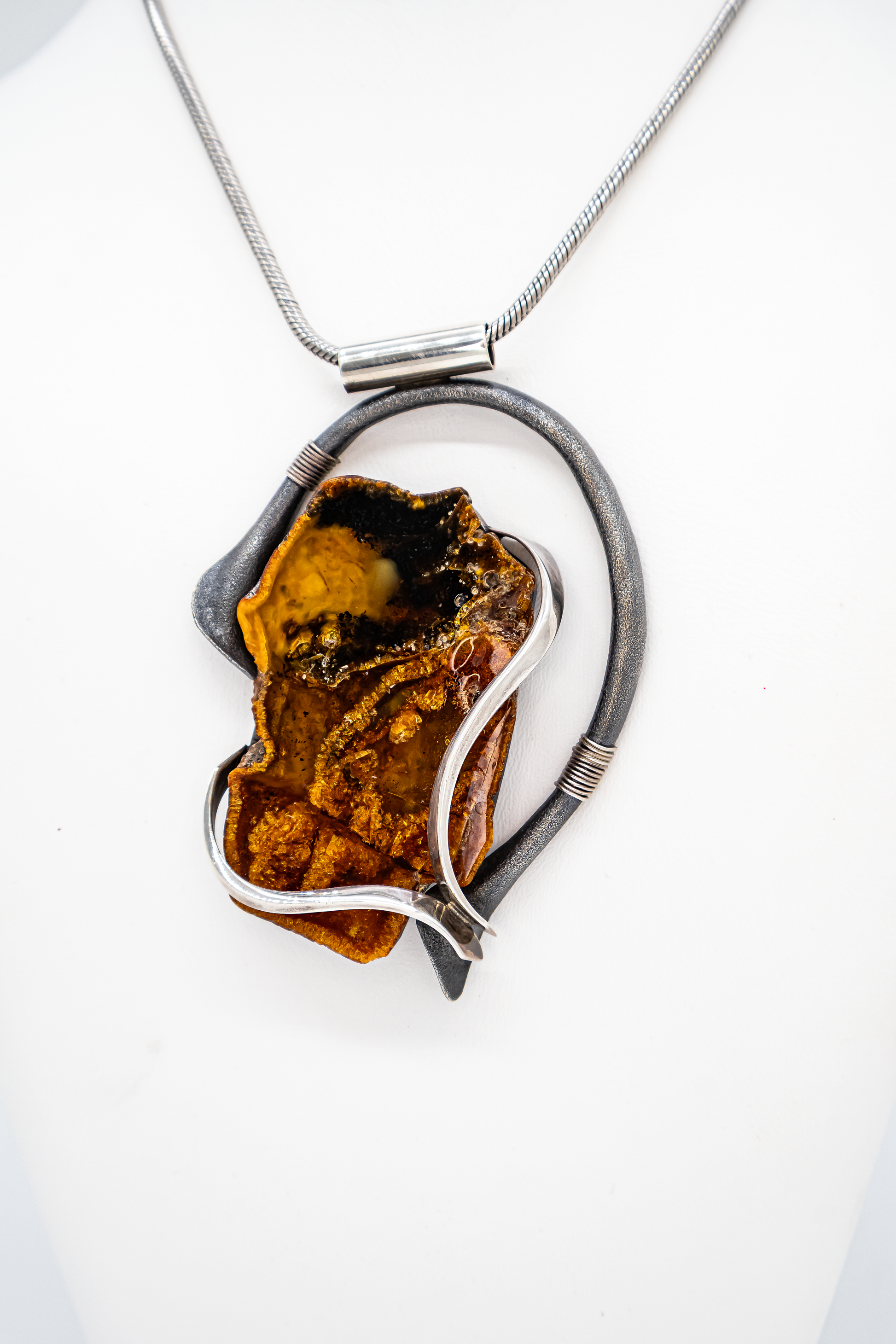 Dieser außergewöhnliche Silberanhänger mit echtem Bernstein ist ein faszinierendes Unikat – ein Zusammenspiel aus Natur und moderner Kunst. Der Bernstein zeigt eindrucksvolle Strukturen in warmen Brauntönen, die von einer handgeschmiedeten, kontrastreichen Silberfassung umrahmt werden.
