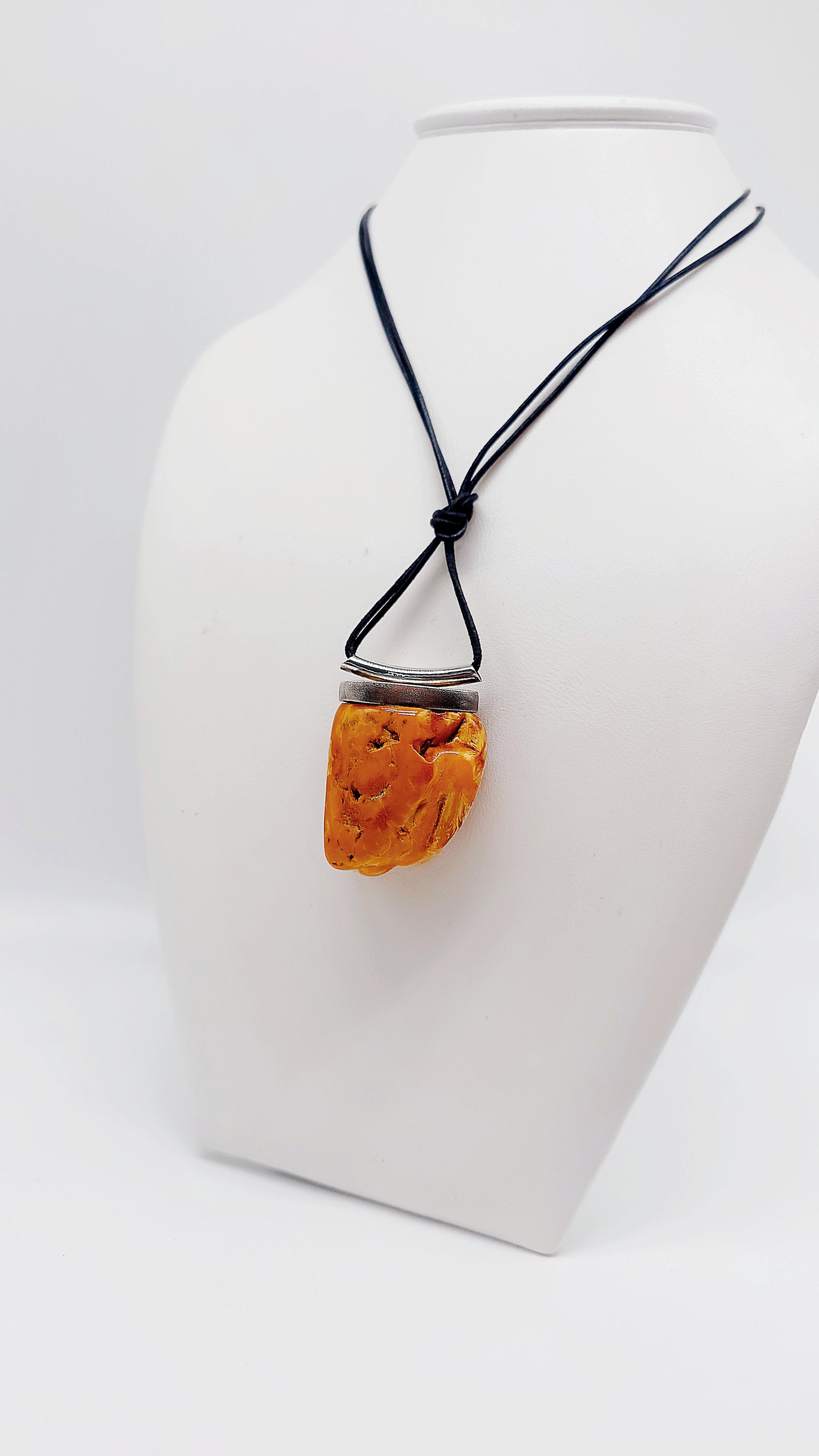 Dieser einzigartige Bernsteinanhänger in seiner rohen, natürlichen Form ist ein echtes Schmuckstück der Natur. Der Anhänger zeigt die unveränderte Schönheit des Bernsteins, eingefasst in eine dezente Silberfassung und an einem robusten Lederband. Jeder Stein ist ein Unikat, das durch seine individuelle Form und Farbgebung besticht. Dieser Anhänger ist perfekt für alle, die die ursprüngliche Schönheit der Natur schätzen und ihren Stil mit einem authentischen, natürlichen Accessoire unterstreichen möchten.