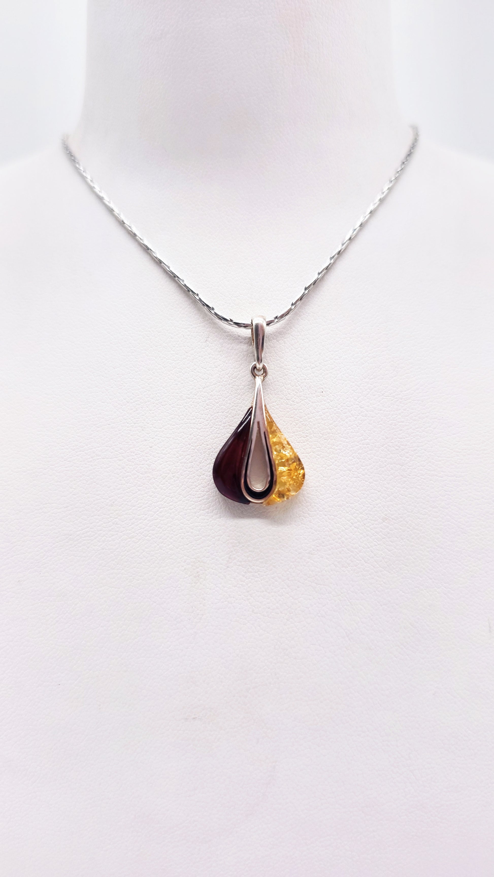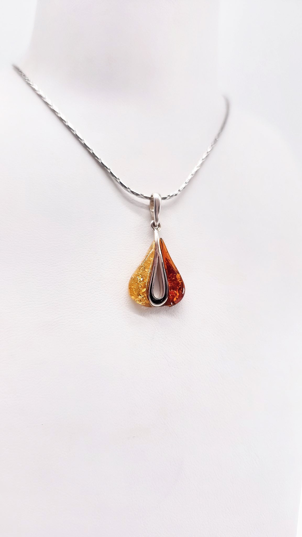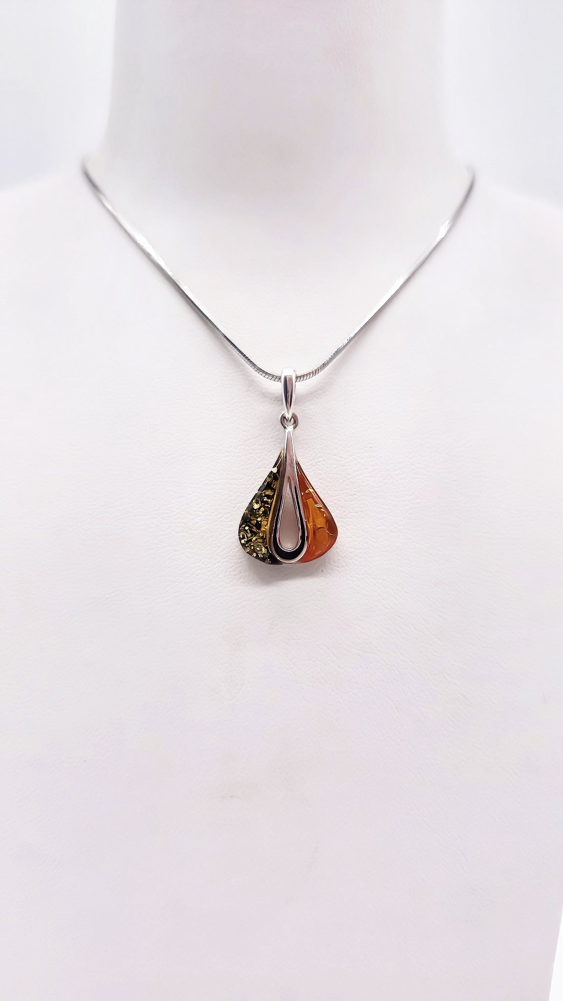 Dieser außergewöhnliche Anhänger aus hochwertigem Silber besticht durch sein tropfenförmiges Design und die faszinierende Kombination aus verschiedenen Bernsteintönen. Die warmen Farben des Bernsteins, die von Gold bis Rot reichen, harmonieren perfekt mit der eleganten Silberfassung. Jeder Bernstein ist ein Unikat, was diesen Anhänger zu einem einzigartigen Schmuckstück macht. Perfekt als stilvolles Accessoire für den Alltag oder besondere Anlässe.