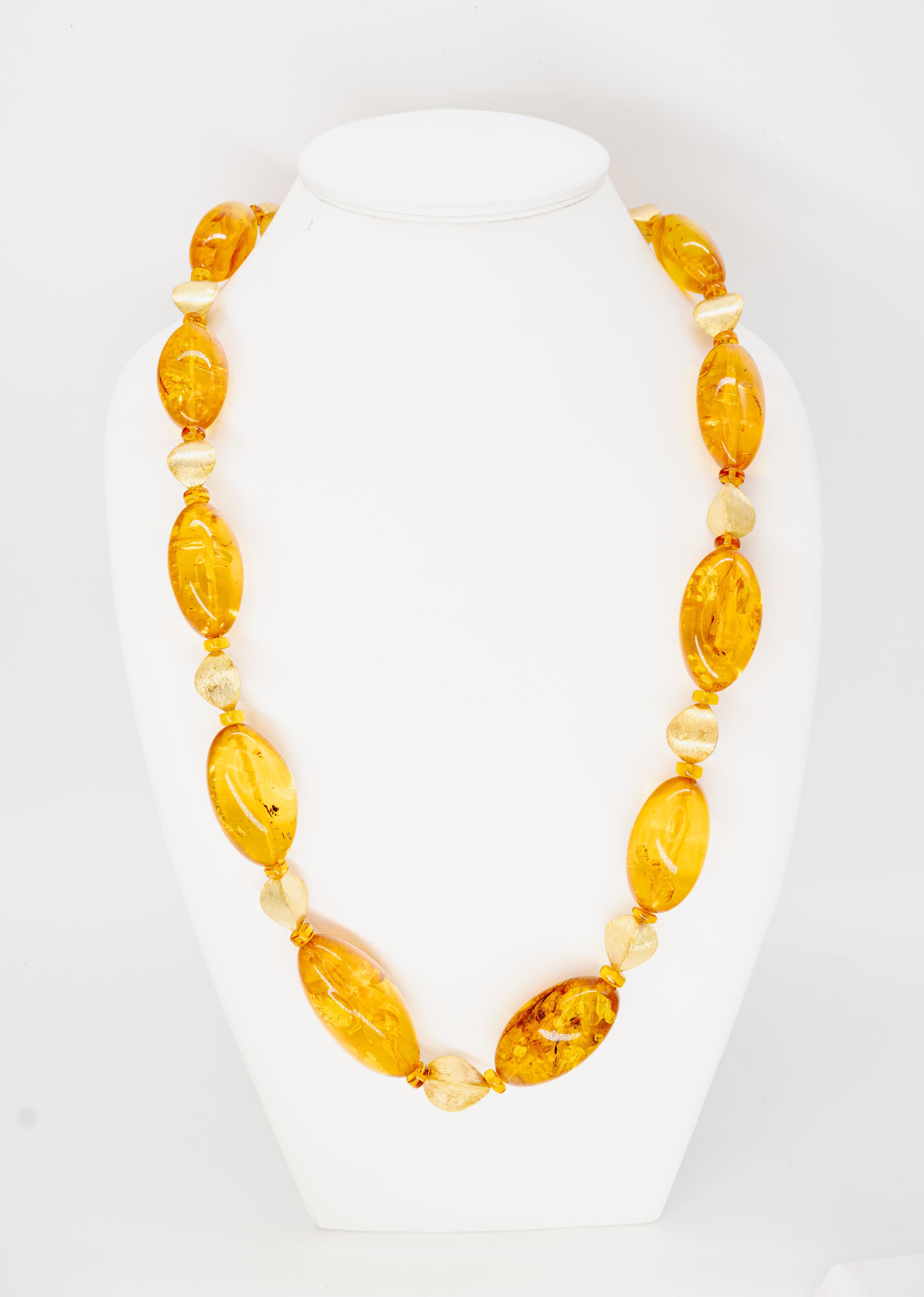 Die oval geschliffenen Bernstein-Elemente werden von hochwertigen, vergoldeten Zwischenelementen stilvoll ergänzt. Diese Akzente aus vergoldetem 24 Karat 925er Sterlingsilber verleihen der Kette eine luxuriöse Ausstrahlung und sorgen für einen harmonischen, modernen Look.