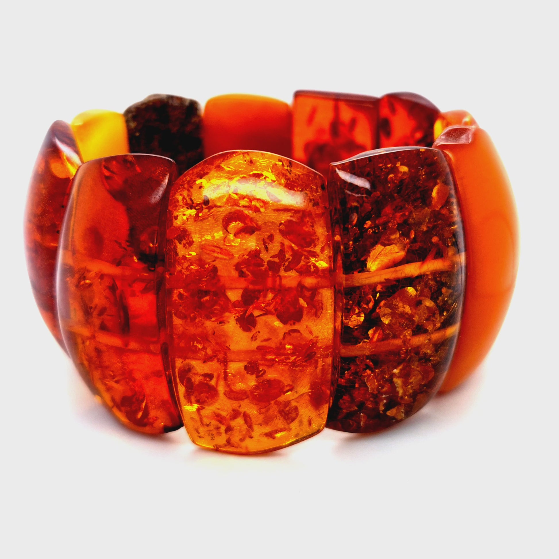 Leuchtender Bernstein mit intensiven Einschlüssen verleiht diesem elastischen Armband eine kraftvolle und einzigartige Ausstrahlung.