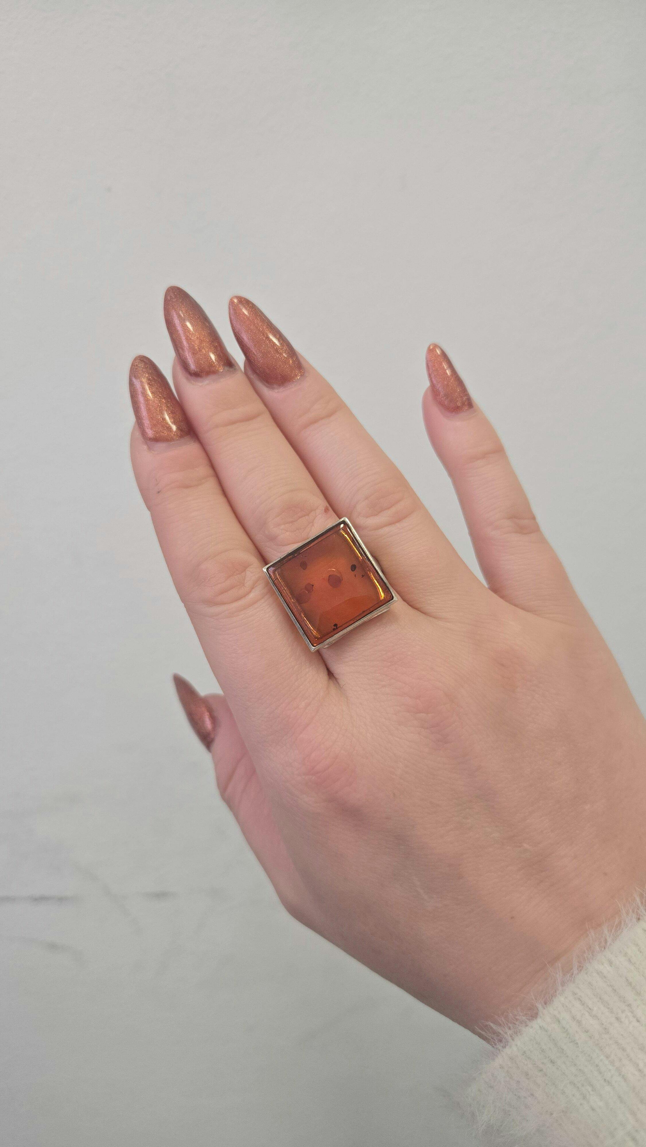 Dieser Silberring aus 925er Sterlingsilber beeindruckt durch einen quadratischen, intensiv orangefarbenen Bernstein, der sofort ins Auge fällt. Die klare Form in Kombination mit der warmen Tiefe des Bernsteins verleiht dem Ring eine moderne, luxuriöse Ausstrahlung.