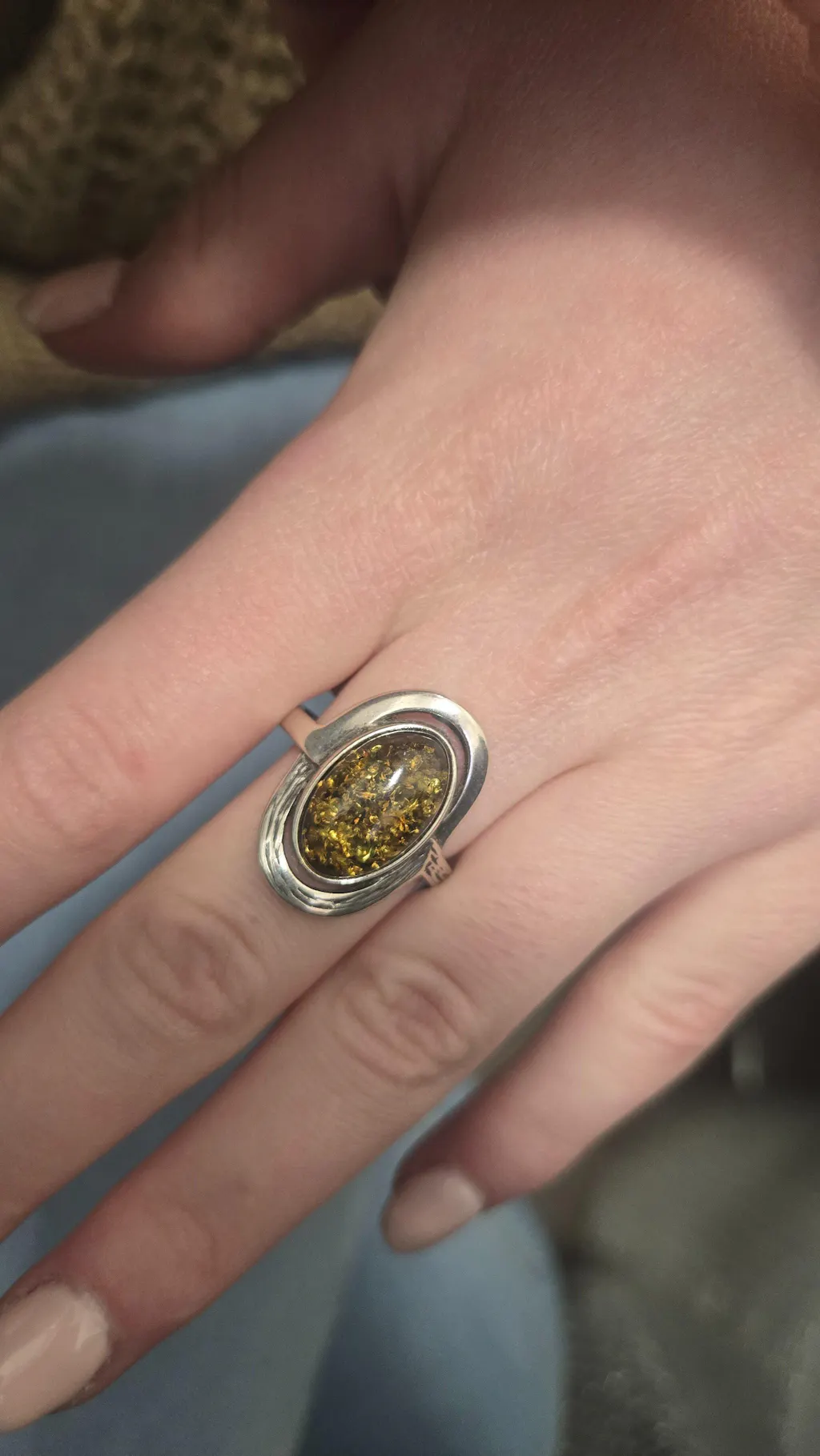 Der ovale grüne Bernstein steht im Mittelpunkt des Designs und fasziniert mit seinen natürlichen Einschlüssen und goldenen Reflexen. Die kunstvoll strukturierte Silberfassung unterstreicht den Vintage-Charakter und verleiht dem Ring Tiefe und Ausdruck.