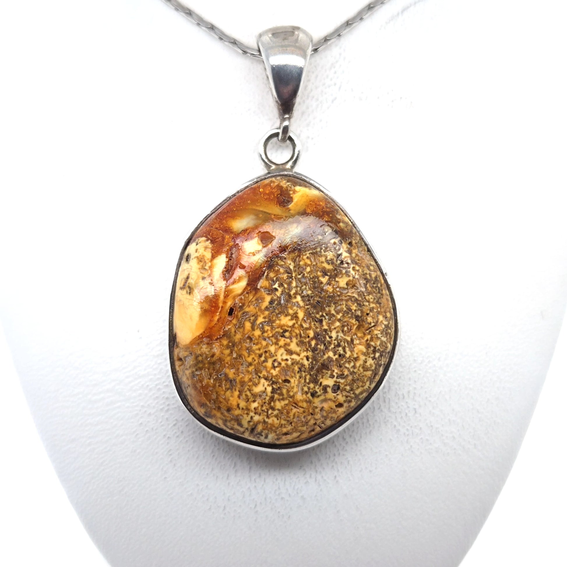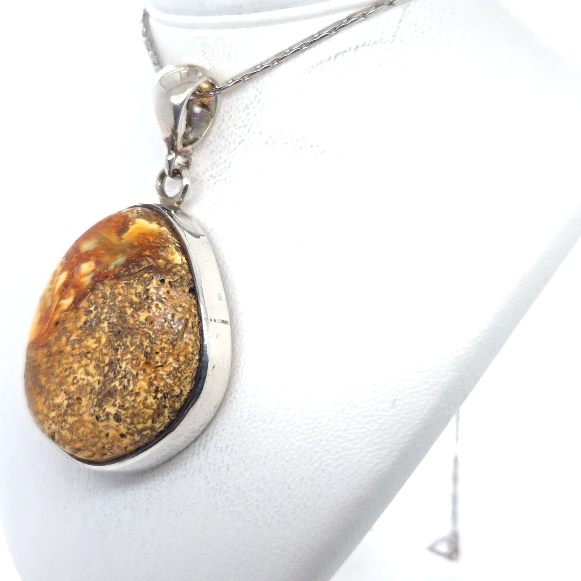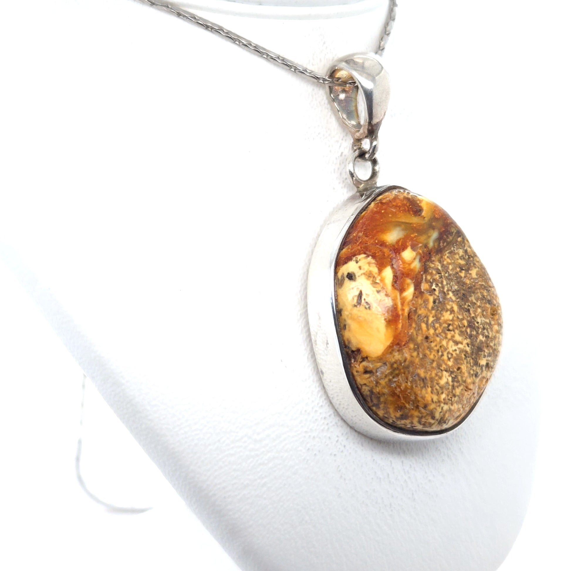 Jeder Anhänger ist ein einmaliges Einzelstück mit unverwechselbarer Struktur und einzigartigem Farbspiel des Bernsteins.