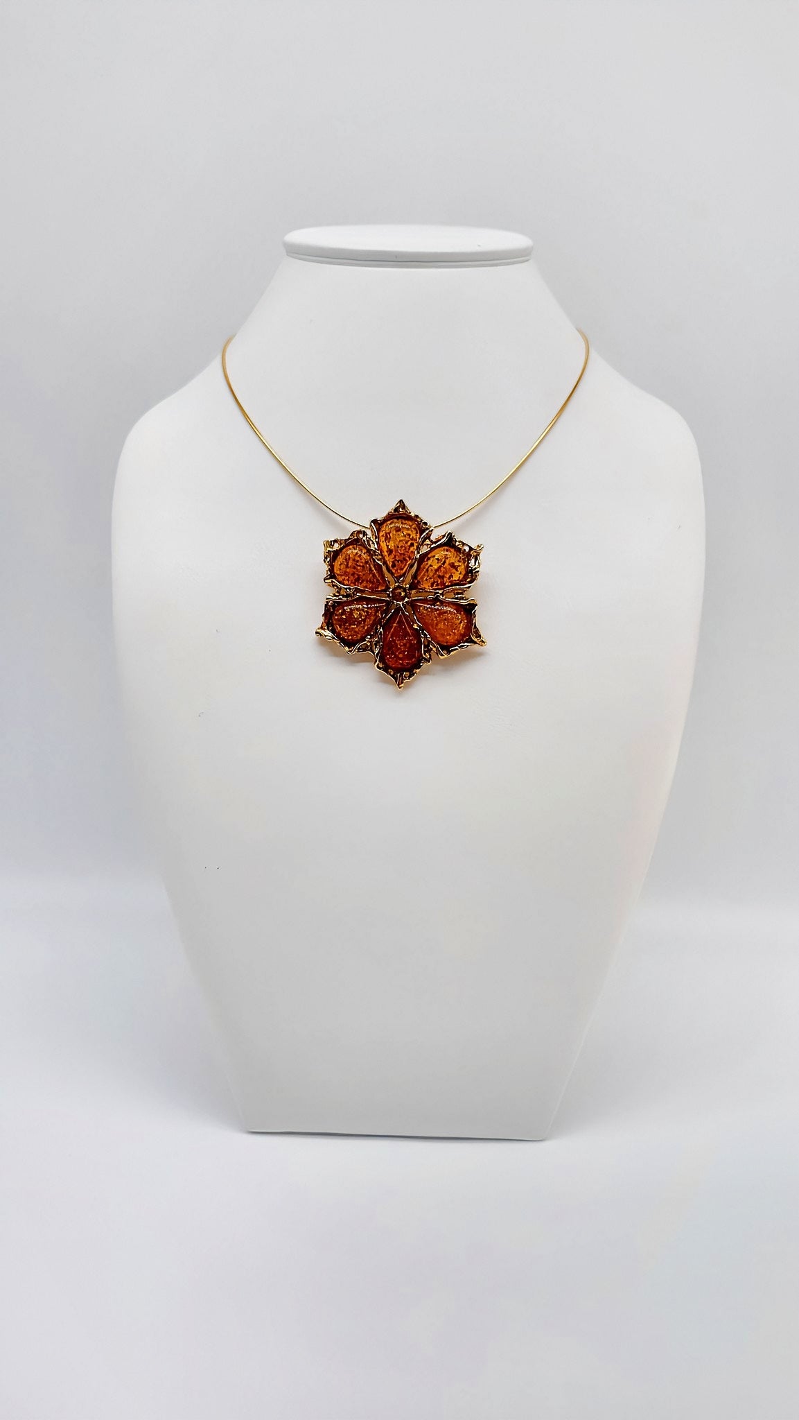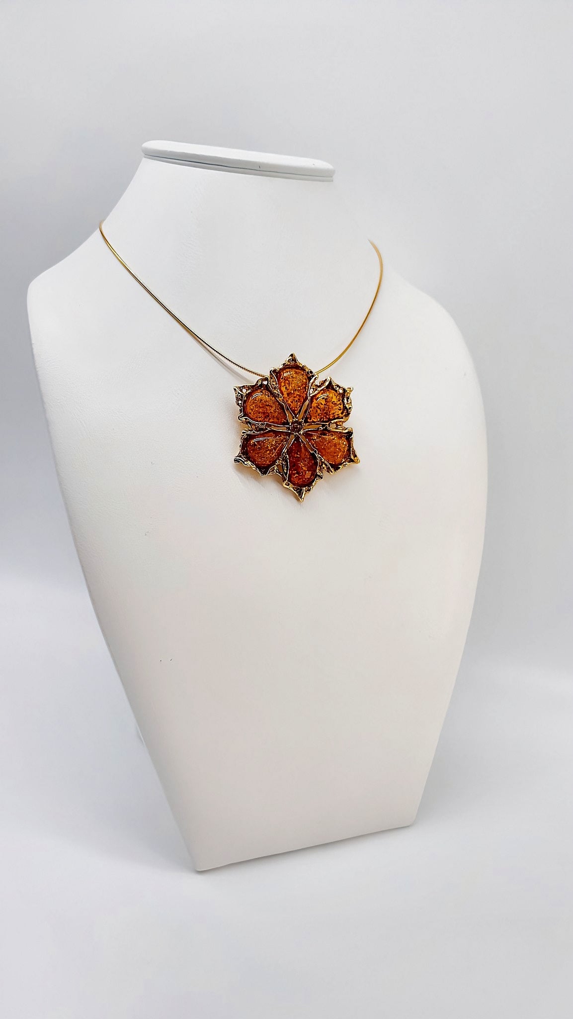 Dieser atemberaubende Anhänger vereint die warme Ausstrahlung von Bernstein mit der luxuriösen Eleganz der Vergoldung. Das kunstvolle Design in Form einer Blüte ist mit leuchtenden Bernsteinen besetzt, die in einer filigranen, vergoldeten Fassung eingefasst sind. Dieses Unikat ist ein außergewöhnliches Schmuckstück, das jedem Outfit eine edle und einzigartige Note verleiht. Perfekt für besondere Anlässe oder als luxuriöses Highlight im Alltag.