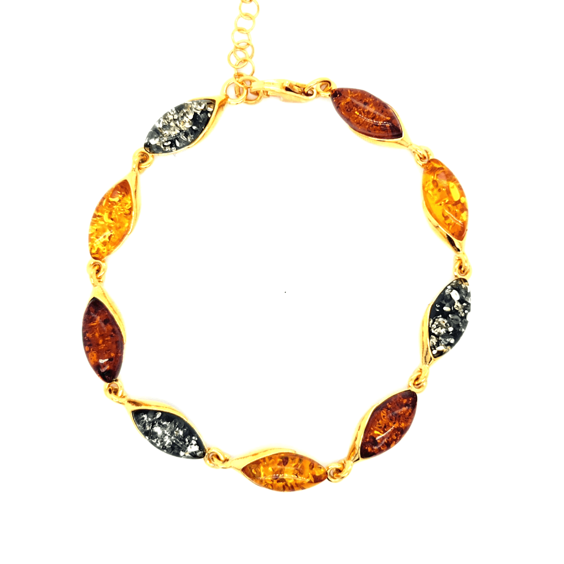 Dieses stilvolle Armband aus echtem Baltischen Bernstein vereint natürliche Schönheit mit eleganter Verarbeitung. Die fein geschliffenen Bernsteinelemente in marquiseförmigem Design sorgen für einen modernen und zugleich zeitlosen Look. Das Modell ist in zwei Varianten erhältlich: mehrfarbig mit harmonischer Mischung aus Cognac, Honig und Grün sowie grünem Bernstein für eine edle, ausdrucksstarke Optik.