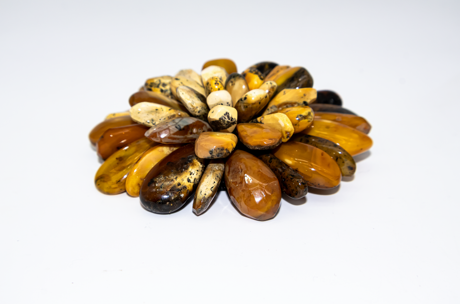 Aufwendige Handarbeit, jedes Stück ein Unikat – die Brosche wirkt wie ein kleines Kunstwerk aus Naturbernstein.