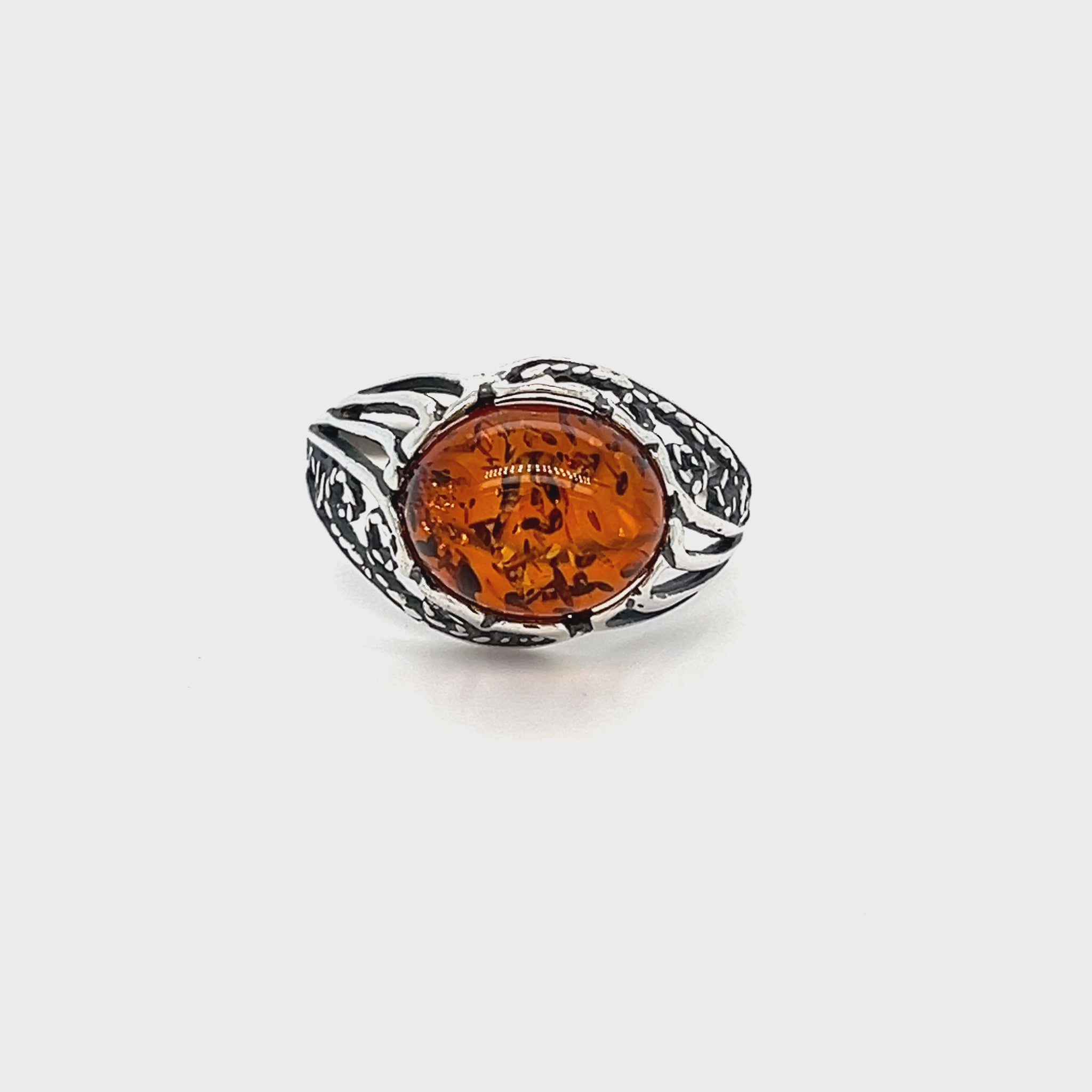 Dieser Silberring aus 925er Sterlingsilber überzeugt durch seinen klassischen Vintage-Stil und einen warm leuchtenden Bernstein mit natürlicher, lebendiger Struktur. Der ovale Bernstein wird von einer detailreich gearbeiteten Silberschiene gehalten, deren Oberfläche bewusst strukturiert ist und dem Ring seinen charaktervollen, leicht antiken Look verleiht.